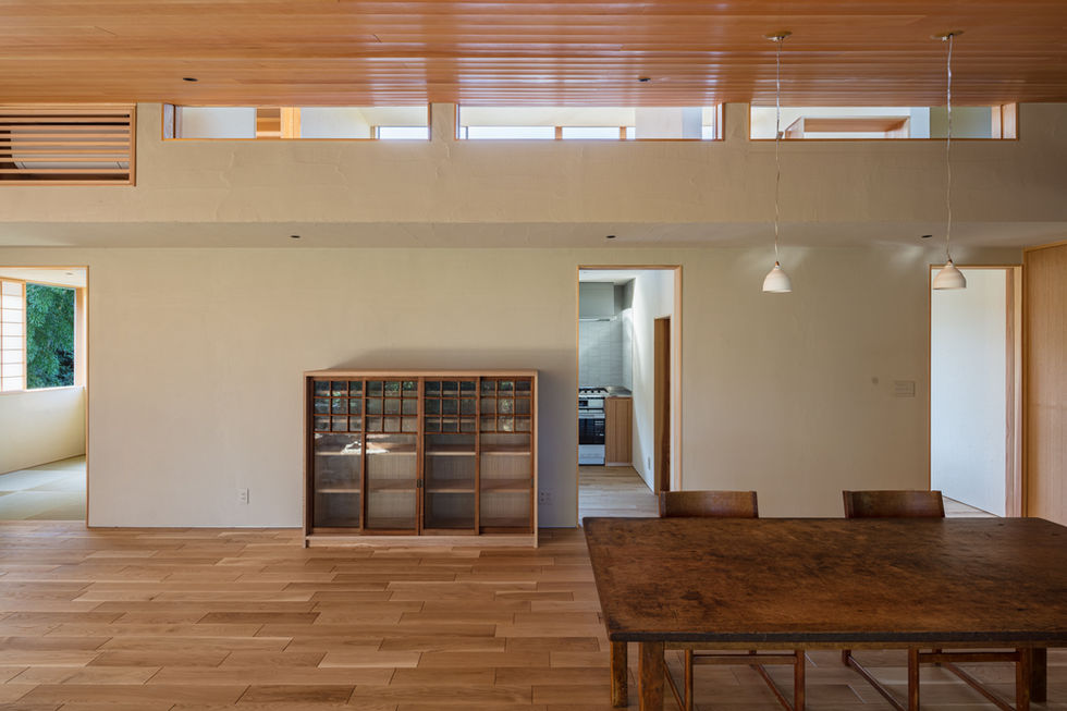 この家は1階が落ち着いた軒の深いリビングで、反対に2階は開けた窓から外光が入る光だまりのような空間です。そこで2階の明かりが間接的に1階に入るように、2つの階をつなぐ開口部をデザインしました。2階からは1階の天井から外の地面まで見え、1階からは2階の窓の外が見えます。どちらの空間も両側の外と繋がっているのを感じられるようにと考えました。また開放時にはそれぞれの階に居るときも家族の気配を感じることもできます。一方、冷暖房を使うなど空間を仕切ったほうが効率的な時は、仕切りを上にスライドさせて開口部を閉じることができます。