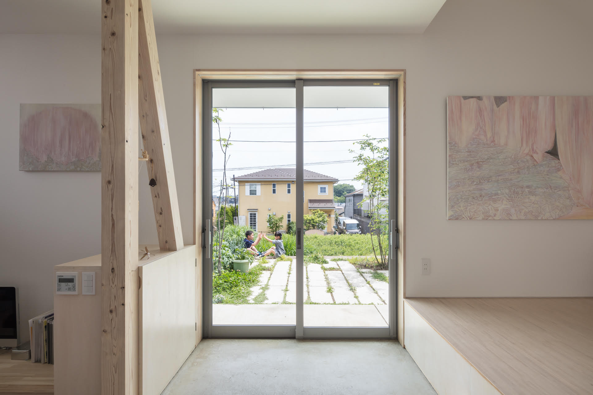 断熱土間引き戸という鍵のかかる引き違いのガラス戸を採用しています。この家は、1階部分がアトリエとしての機能を兼ねており、プライベート空間として外から過剰に切り離す必要はないと考えました。また玄関の場所自体も、道に面しては作らず、敷地の真ん中から建物にアプローチできるので、道から丸見えというわけではありません。イメージとしては縁側から家に入るような形になります。一般的に玄関と言うと、どうしても狭く閉じていて、他の用途のない空間になりがちです。この家ではそのような場にしたくないと考えました。物と人の動きは連動するので、用途が固定される空間を作ると、そこに暮らす人の生活もそれに合わせて固定化されてしまいます。私たちは住まい手の生活の変化にも対応できるように、なるべく空間を自由に開けたものにし、その分光や風などの環境的な要素を感じられる家を創りたいと考えています。