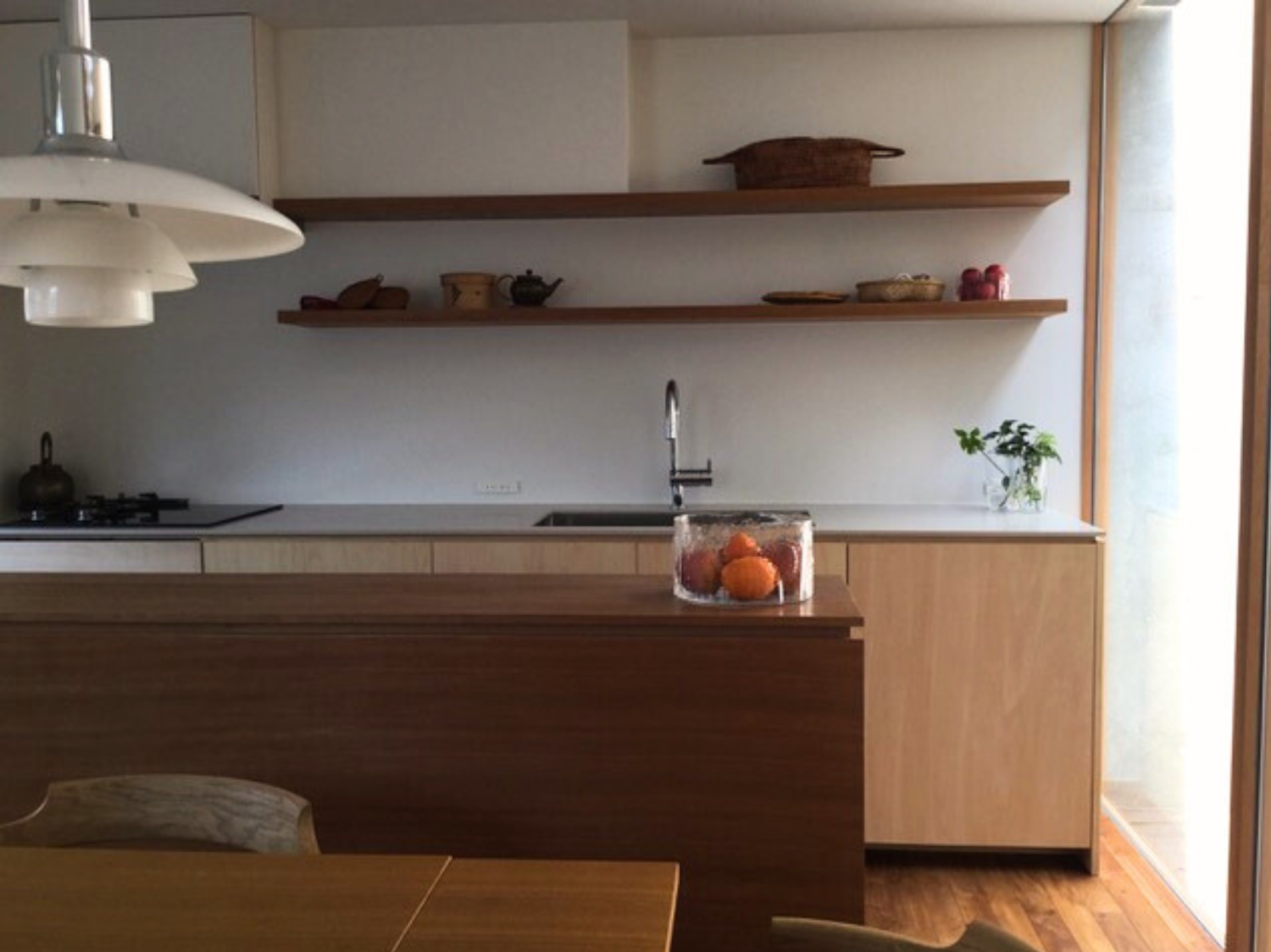 今後生活スタイルが変わったときにも柔軟に対応しやすいように、敢えて大らかな扉割にしていますが、引き出し内には無印良品の整理ボックスがきっちり収まるよう計算し、1段1段の内寸をミリ単位までこだわって決定しています。また、この収納がキッチンとダイニングの間にあることで、空間に緩やかな仕切りができます。