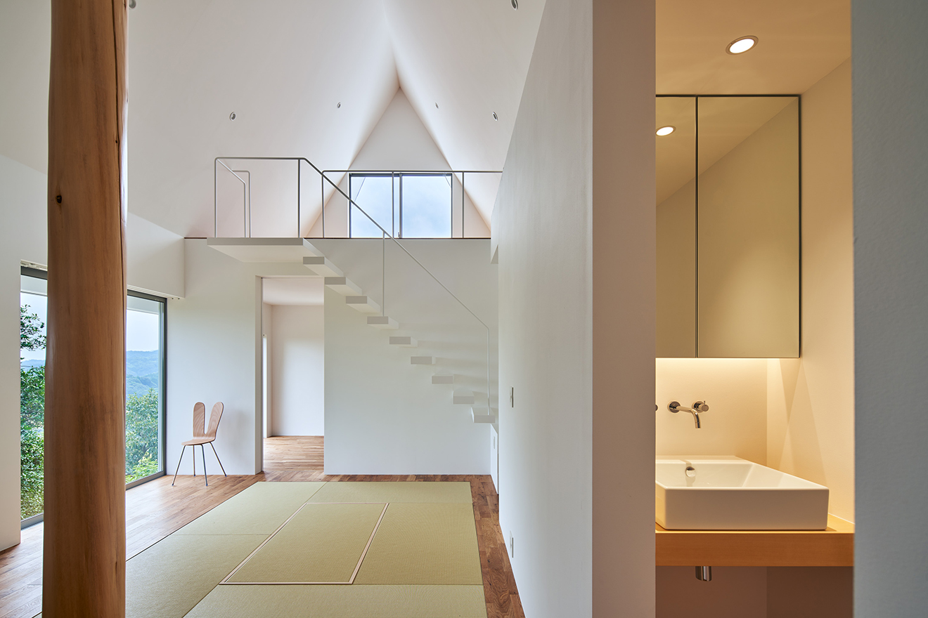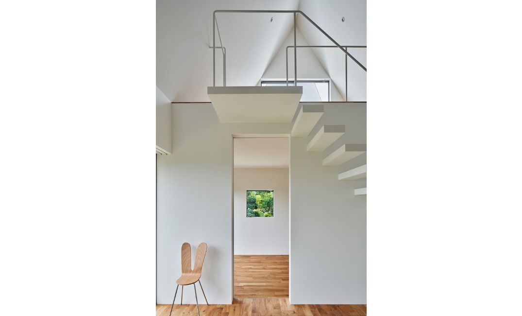 『忌部の離れ』は、絵を飾るため内装はシンプルな色味にしたいという希望を受けて、白を基調とした空間にしました。その中で階段も閉じた専用空間にして面積をとってしまうよりも、シンプルで壁と一体化したような白い階段にして、室内に見せるデザインにしようと考えました。