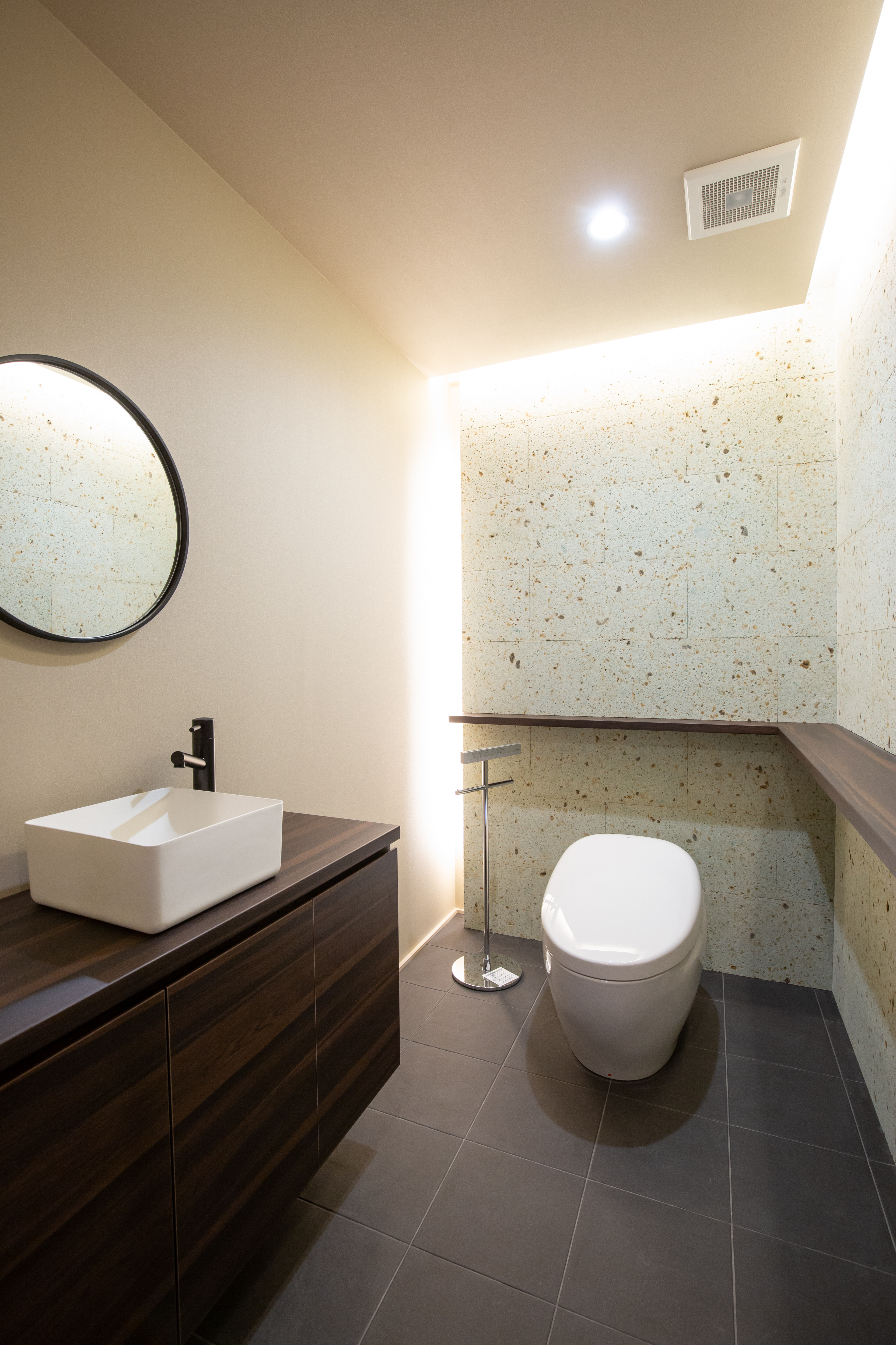 プロの住宅レシピ 大谷石がアクセントの大空間 魅せるトイレ