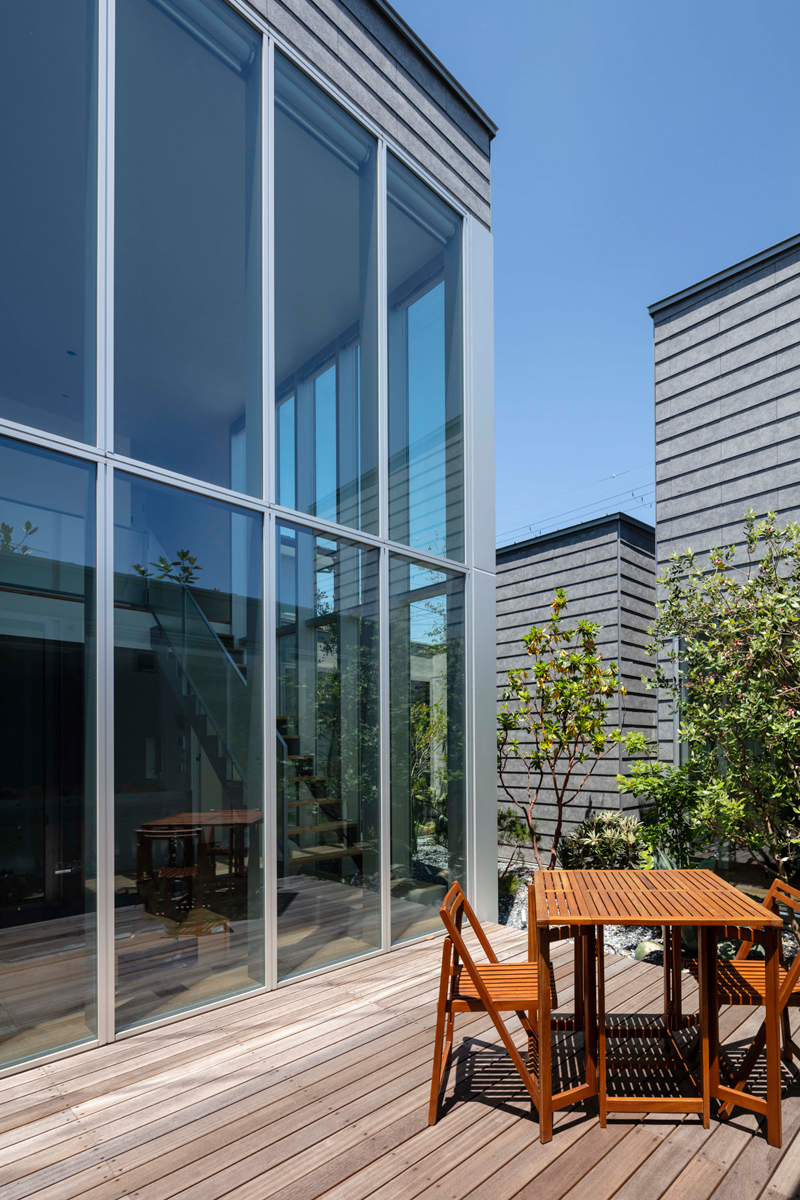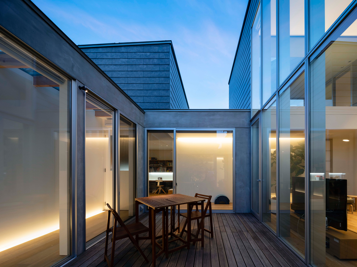 3世代は生活時間やスタイルが異なるため、それぞれの世代の部屋は分棟とし、各部屋と共有するリビングと中庭を中心に配置しました。中庭を囲む回廊を通じて往来したり、リビングから中庭越しに各部屋の気配が感じられるため、3世代の繋がる場として大きな役割を果たします。