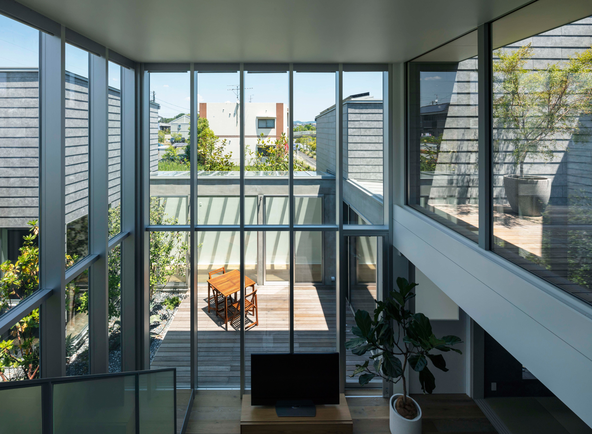 また、中庭のウッドデッキと植栽の部分をL字型に配置することで、室内外に一体感を持たせ、中庭を含む広がりのあるリビングとなりました。これに合わせて、サッシもL字型に配置。ビル用のサッシを採用することで、高さ5.25メートルの大きな窓が実現できました。