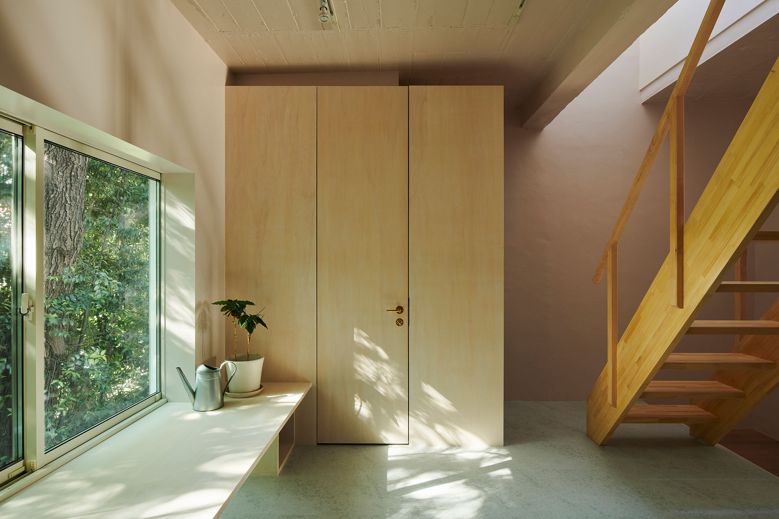 そこでトイレを下のフロアにも設置し、大きなワンルームとなっている2階のLDKからそのままトイレに入る配置となりました。部屋の中でトイレの存在が主張するのは気持ちがよくないと考え、生まれたのがこの工夫です。写真1枚目のように、ドアと左右の壁部分の木材を等間隔に割り付け、天井部分まではふさがない形にして、一見ドアとは感じないようにデザインしました。合板仕上げの扉で、トイレスペースの垂れ壁部分にかぶさるので壁部分とドアが同じ見え方になります。