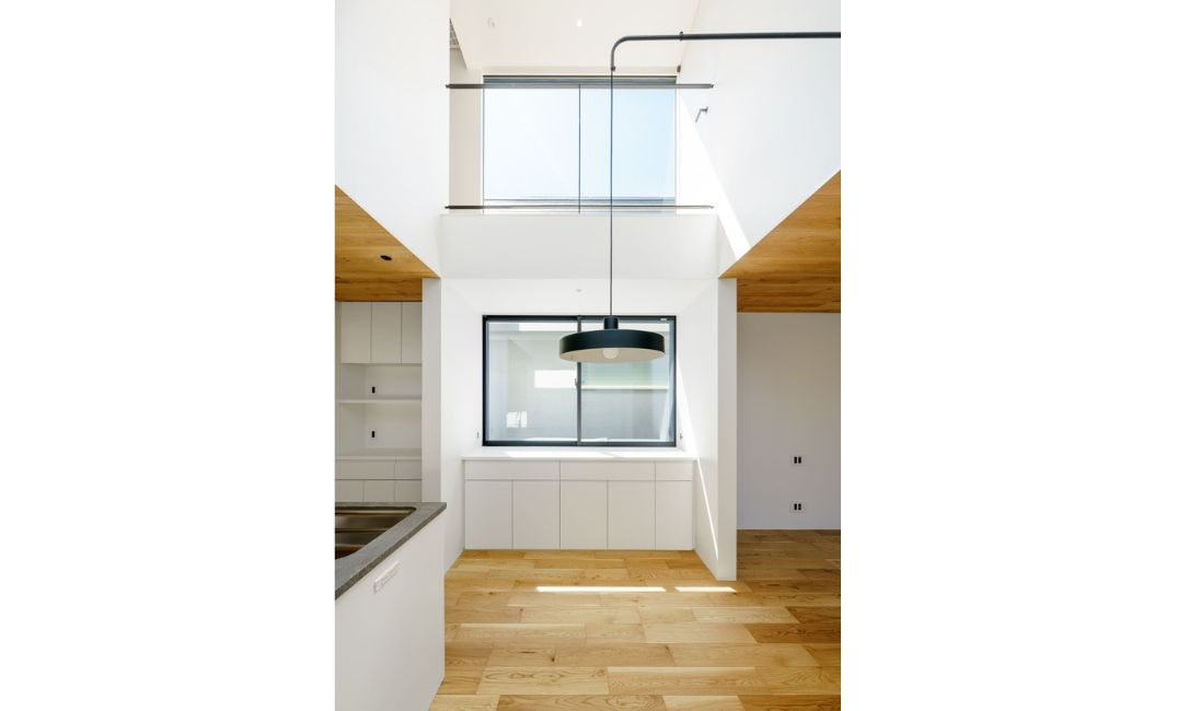 大きな南側の最上部の窓から採った光が吹き抜けからフロアに降り注ぎ、さらにそのフロアから北側へ向けて設けた下階へつながる吹き抜けを通って玄関まで届きます。これにより家の中のどこにいても外の変化を感じることができます。