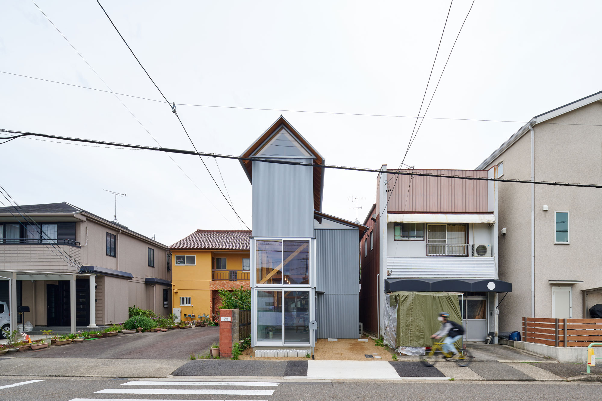 活気のある住宅地に建つ、「何階建て?」「人はどこに居るのだろう?」と思わせる、余白を浮かべたすこしふしぎな外観をもつ住宅です。