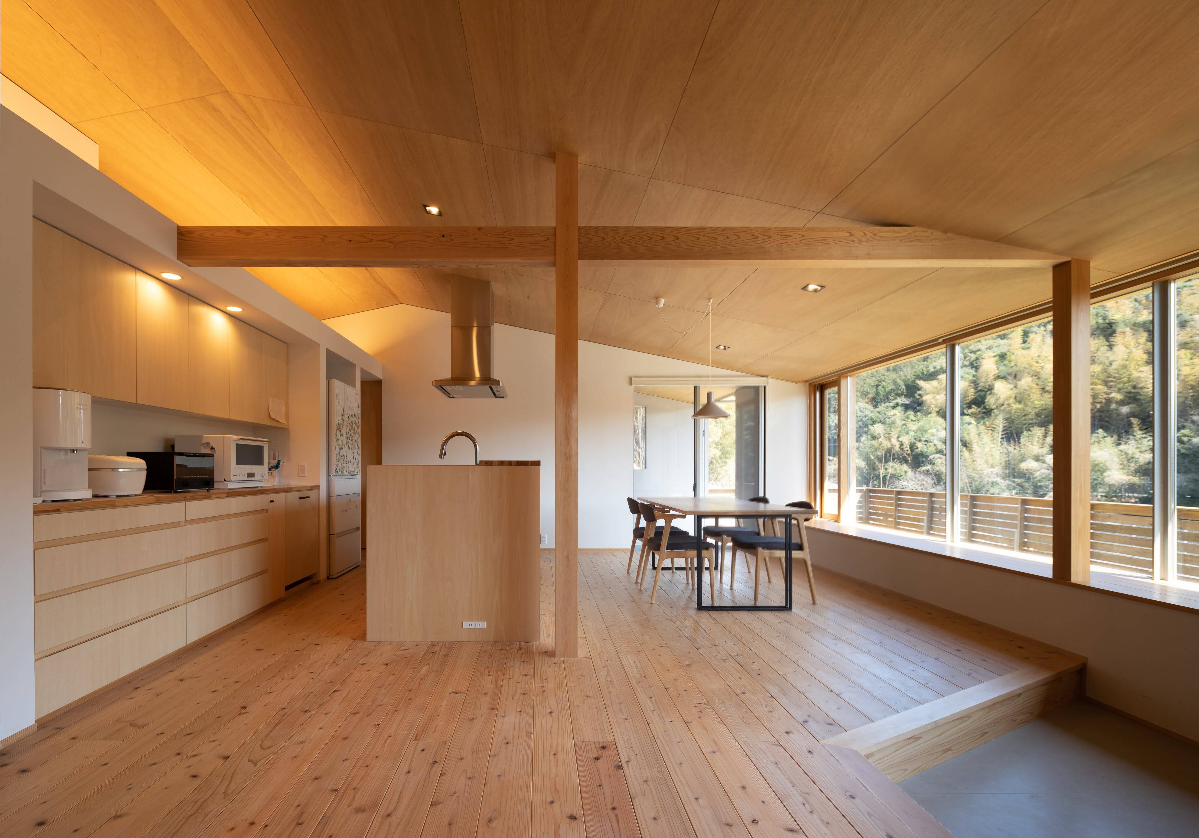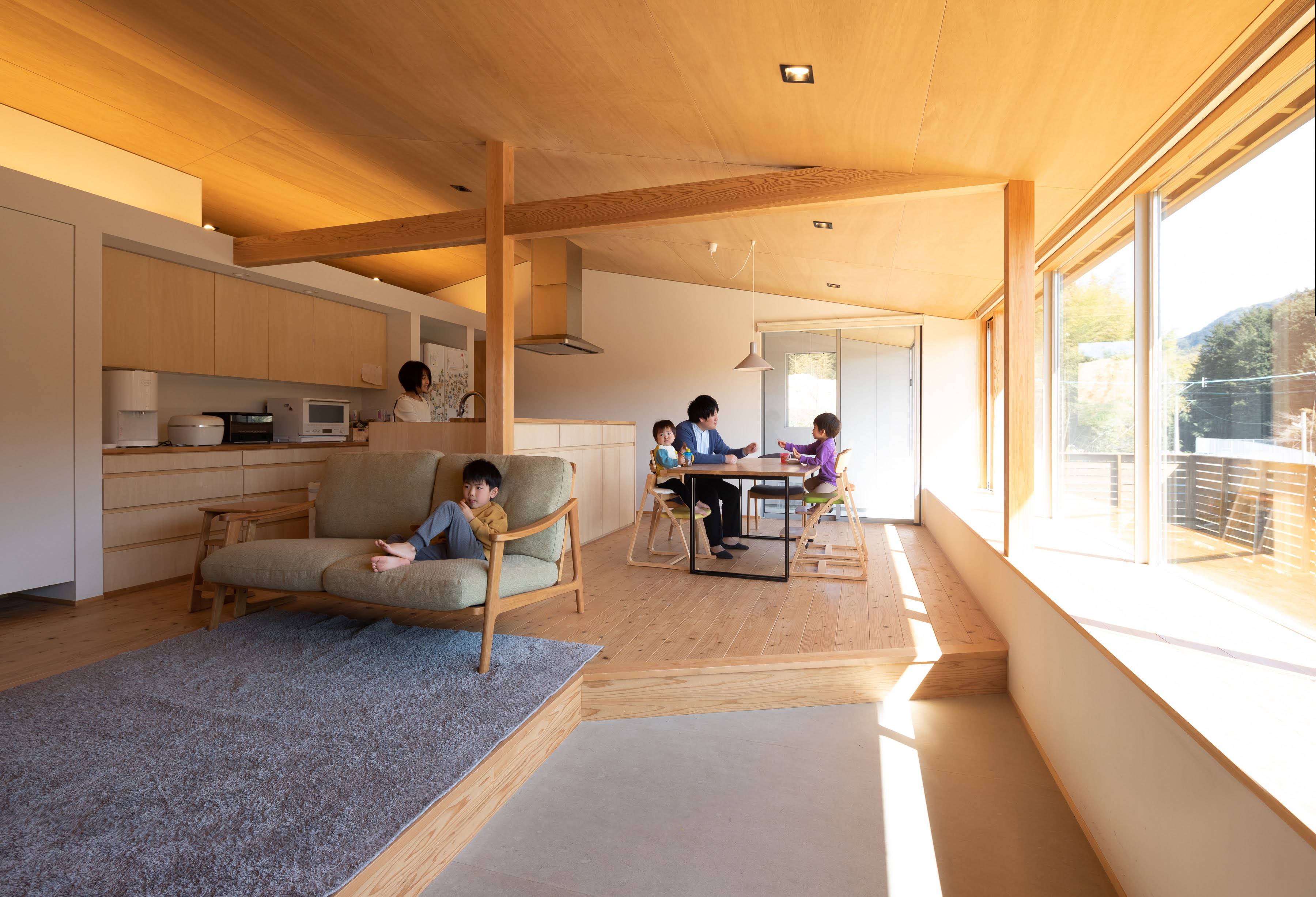 『福津の家4』では湖が臨めるLDKに主役となる大きな窓を配置しました。ベンチのように腰掛けたり、子供たちの遊び場として使えるように、幅のあるカウンター状の出窓です。