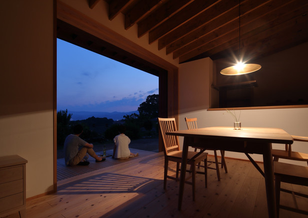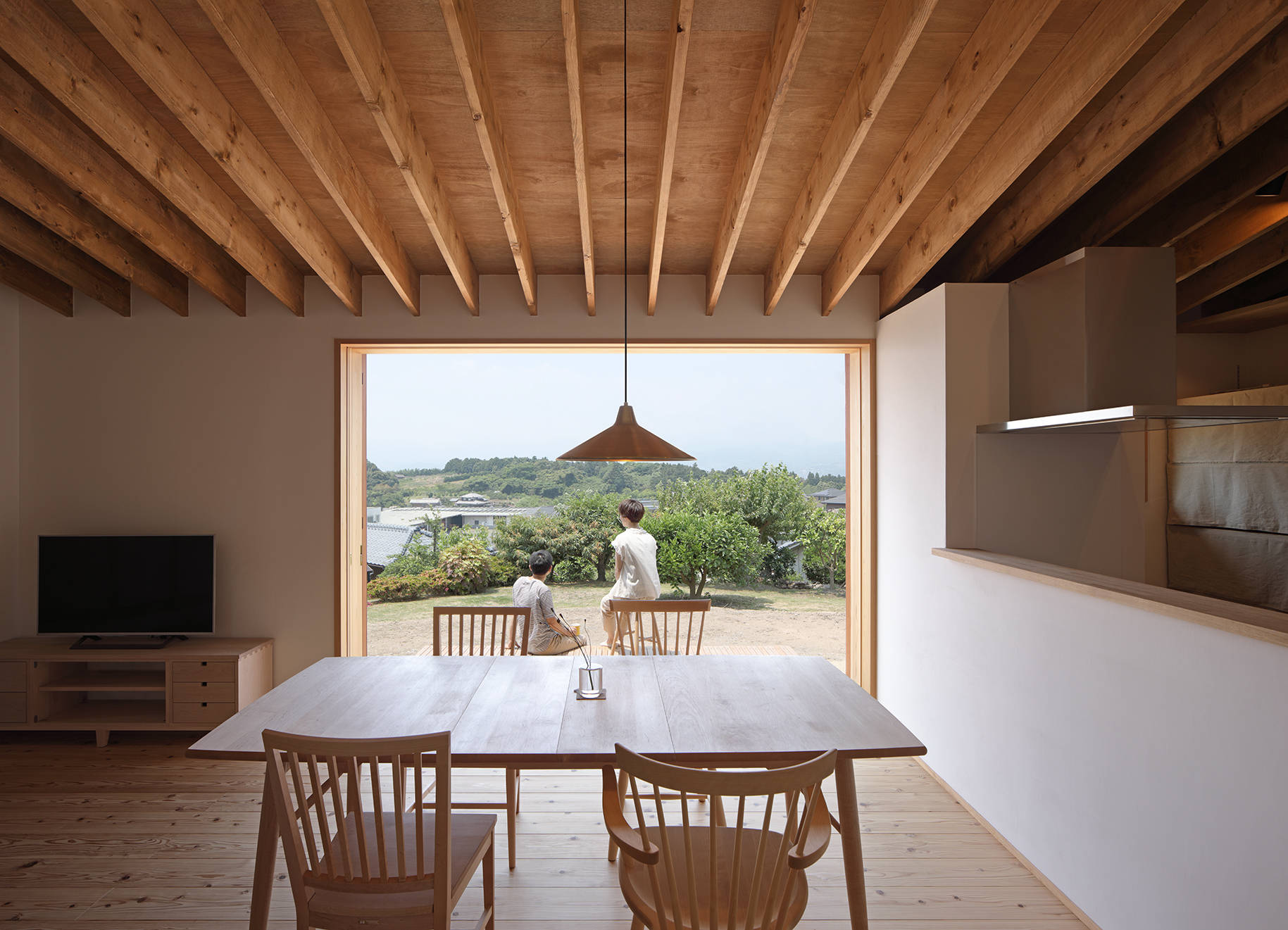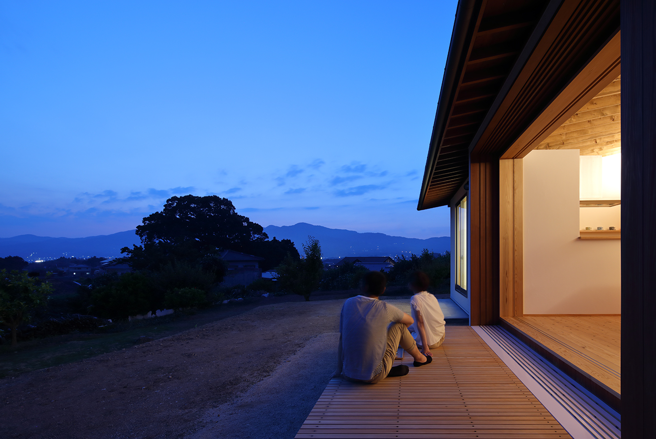 この『日出町の家』の大きな窓は実は西側を向いています。普段は西側は日射しの問題などで大きく窓を採ることは少ないのですが、ここは実は別府湾を臨む立地となっていて、花火などが見える立地なので、思い切ってこちらに大きな開口部を設けました。その分木製の建具に、雨戸や障子なども備えて、必要に応じて環境の調整ができるようにしています。