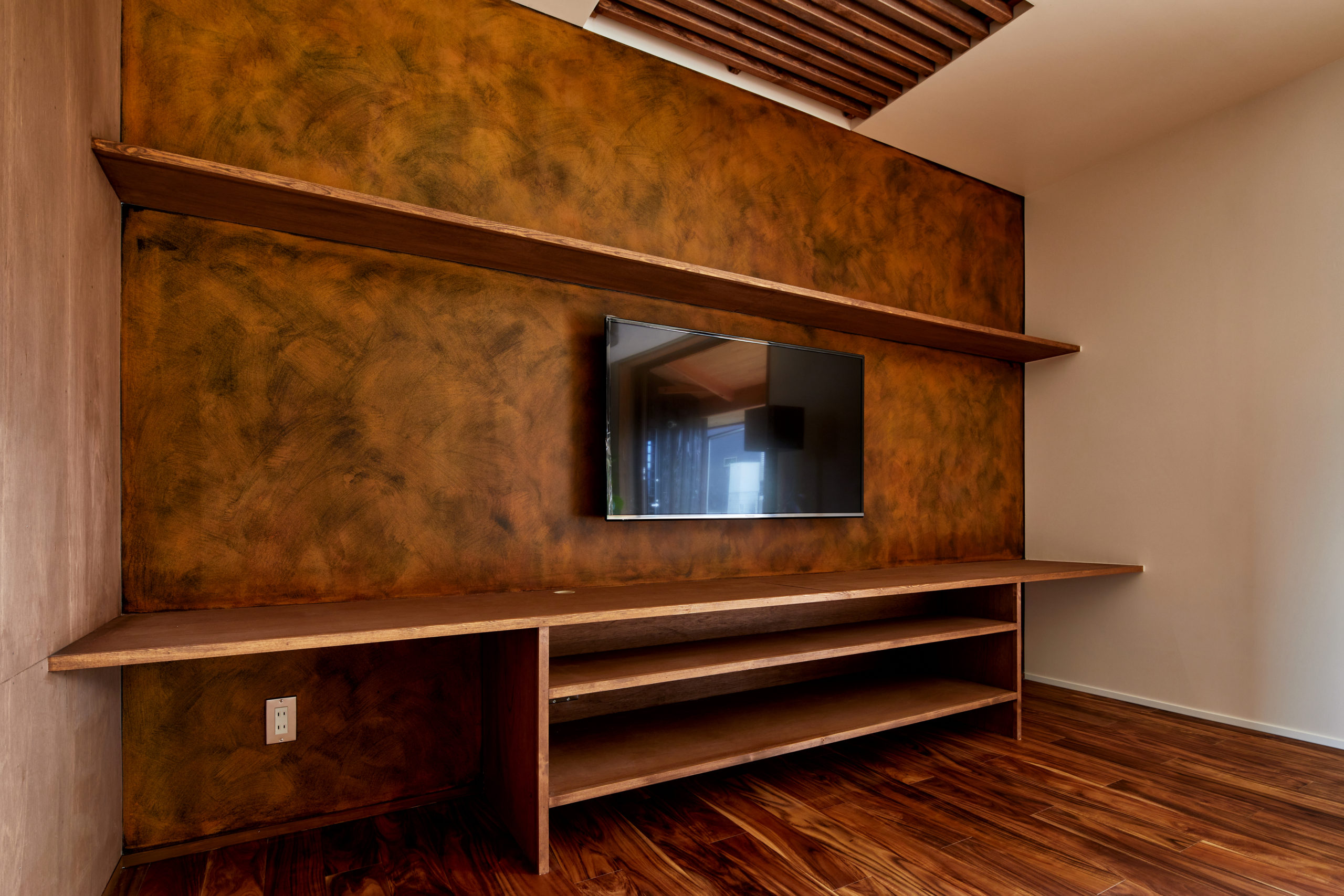 『アサハウス』も施主の方にとって思いのこもった家になるように、テレビ裏の独特の風合いを持つ壁は、施主の方と塗装を行いました。理想の質感を探して様々な材料や塗料を試して、この鉄片入りの塗料と錆を出す酸化剤+錆止めを採用しました。施主の方と、塗料を塗って、酸化剤で錆を出し、理想の錆具合になったところで錆止めを塗って完成させました。鉄が入っているので少し塗料が固かったり、ちょうど良い錆具合を見極めるのが難しかったり、となかなか大変だった分、他にはない、ここに住む家族のための家ができたと思います。