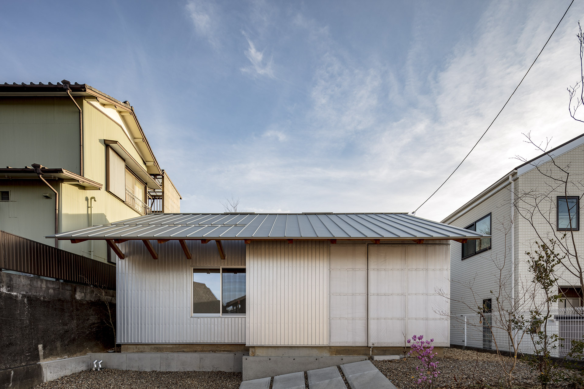 外装のポリカを、隣り合うガルバリウムとほとんど同面でおさめていることや、下から上まで1枚で開閉するようにしたことで、「開く壁」のような印象となるようにデザインしています。