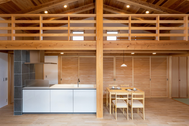 家の中央に広くとったLDKは、天井の構造材を活かし、屋根野地板をあらわにすることで、天井が高くなり空間が広くなります。また、天井や壁は配線が見えないよう工夫し、ダウンライト風のシーリングタイプの照明を採用することで、空間の広さが強調されます。