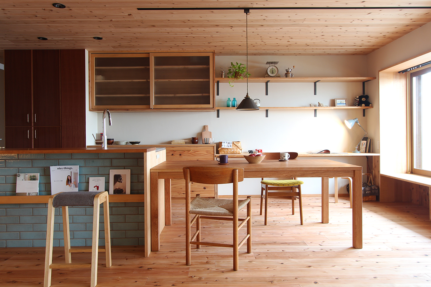 『大宮の家』では施主の方が無垢の木の扉が良いということだったので、杉でキッチンの扉と背面の食器棚の引き出し部分を揃えました。