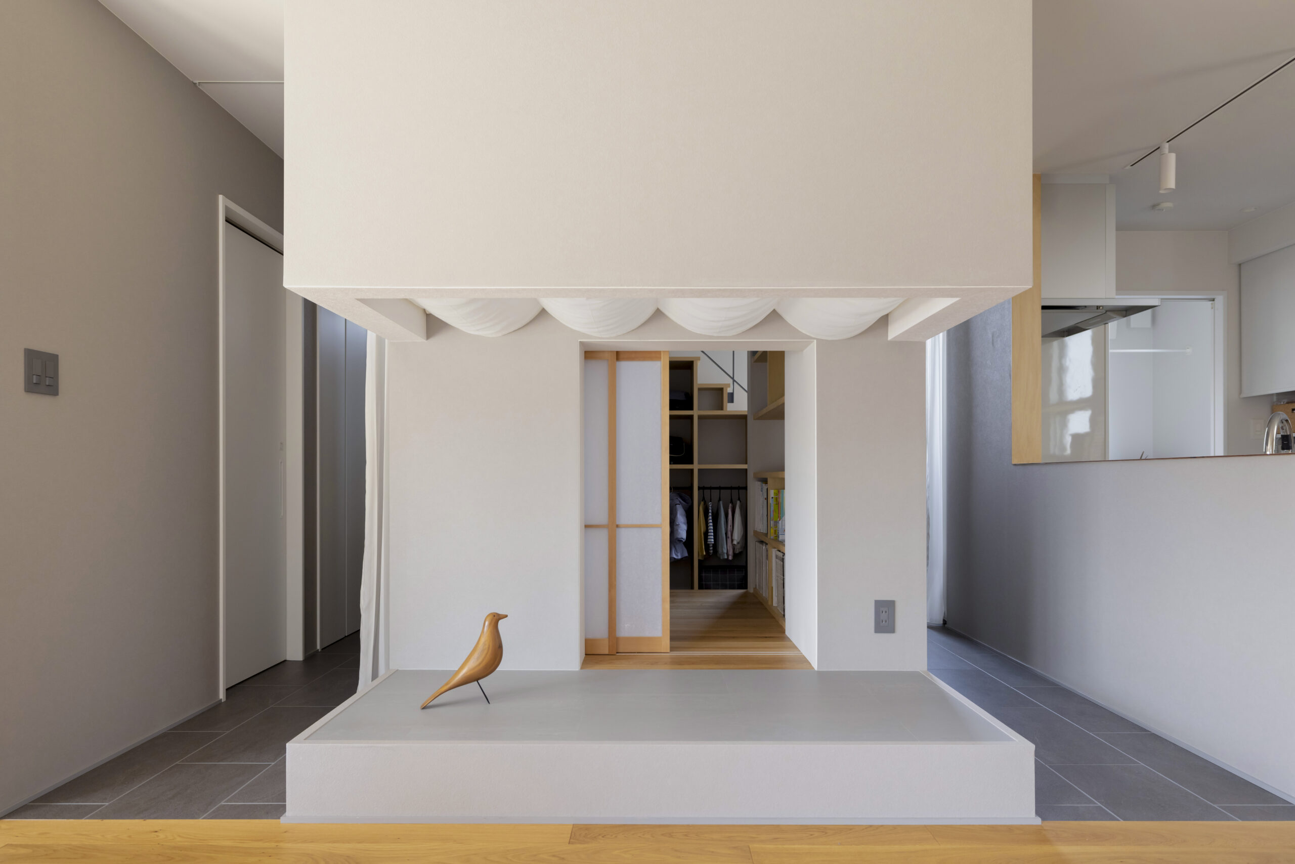 また、その向かいにはお子さん専用の学習スペースを設けました。自分の居場所として落ち着けるように独立はしていますが、両側はロールスクリーンや障子で廊下とリビングにつながっており、孤立はしていません。背面にはキッチン側につながる小窓もあり、お互いの様子を見ることもできます。つながりながらそれぞれの個も大切にする、そんな家族のための家になりました。