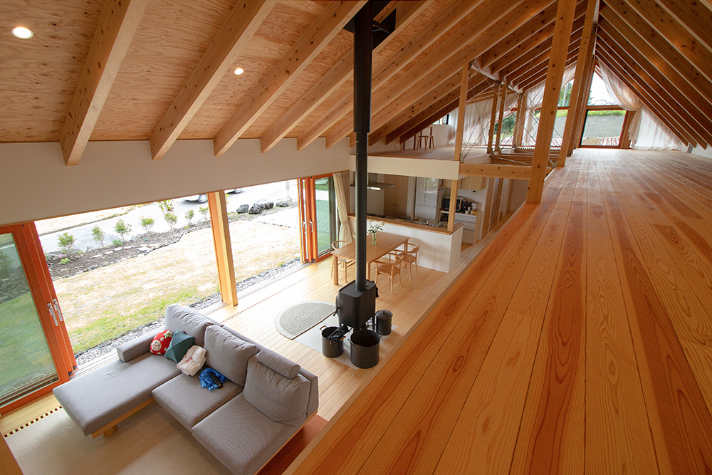 さらに、フローリングには無垢材を使用することで、床下暖房の暖かい空気の力で無垢材が温まり、素足でも快適に過ごせます。1階を温めた暖気はロフトとなる2階にも上がり、リビングだけでなく家全体を優しく温めます。大きな開口部含め全てのガラス窓には、トリプルガラスのサッシを採用し、断熱性を向上させました。