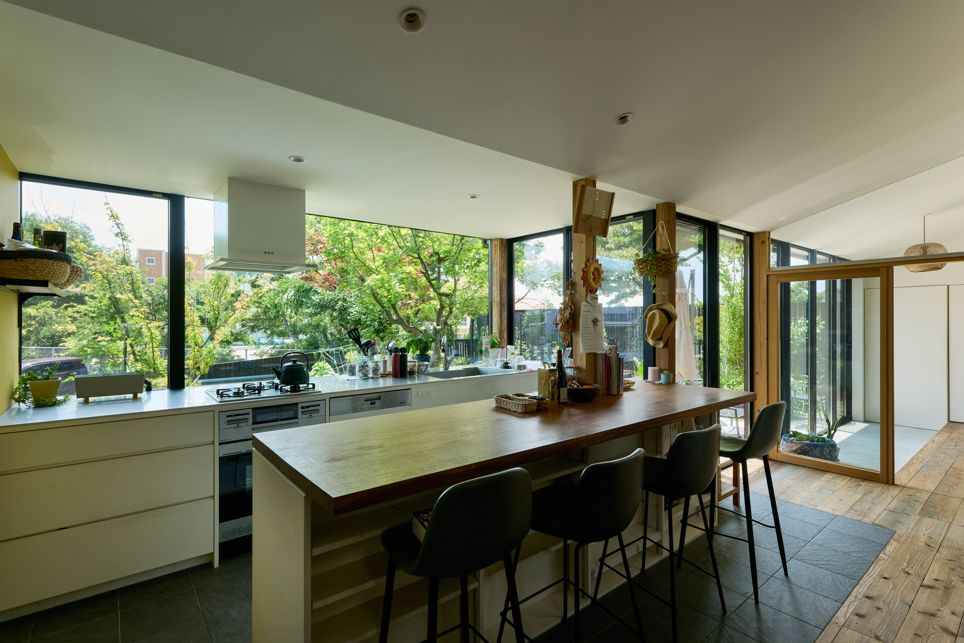 元々住宅とは切り離されていた美しい庭を活かし、新しく設けた土間が住宅と庭を緩やかにつなげます。家の奥にあったキッチンは、庭の景色を楽しむことができるように庭に隣接するように再構築しました。