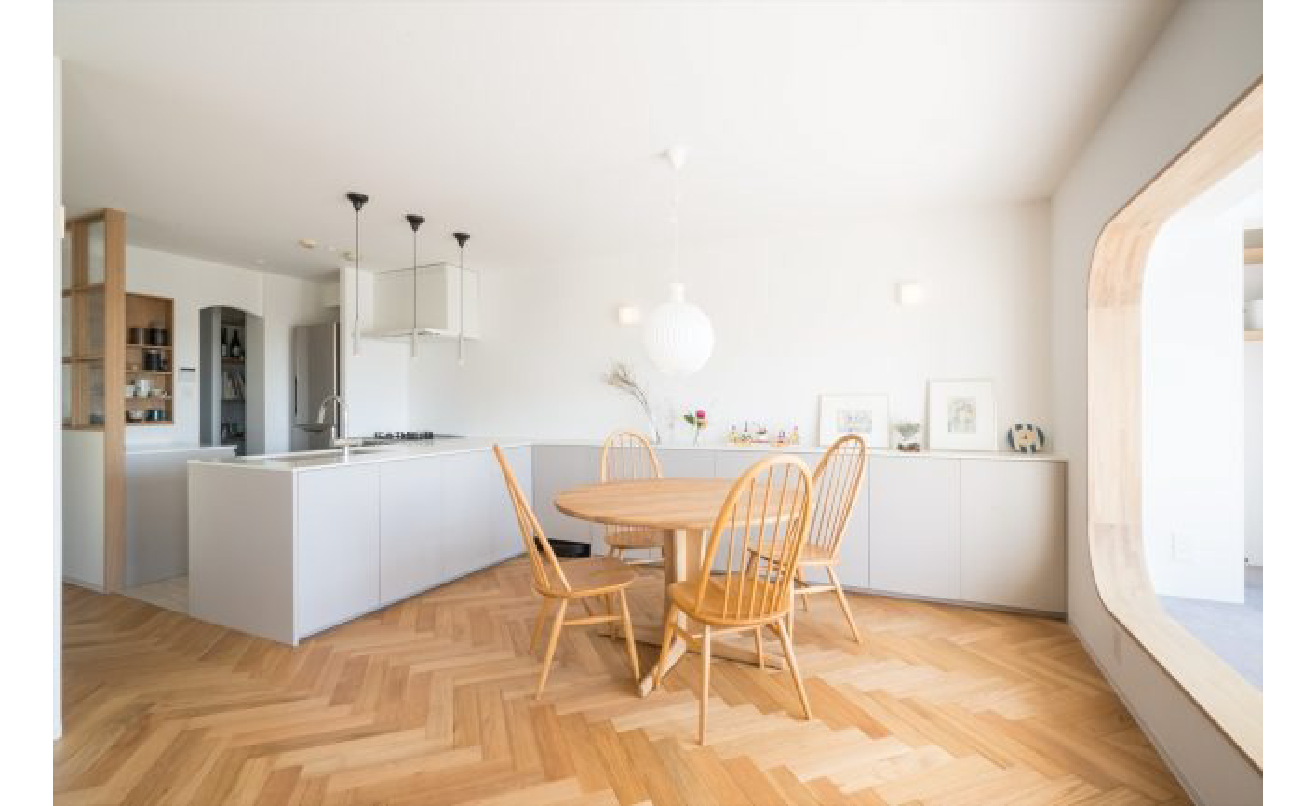 カウンター下は自由に収納できるオープンタイプにし、パネルヒーターも設置しました。床下の基礎断熱の空気の出入口となるスリットをパネルヒーターの下に設け、床下の空気循環と暖かさに配慮しています。