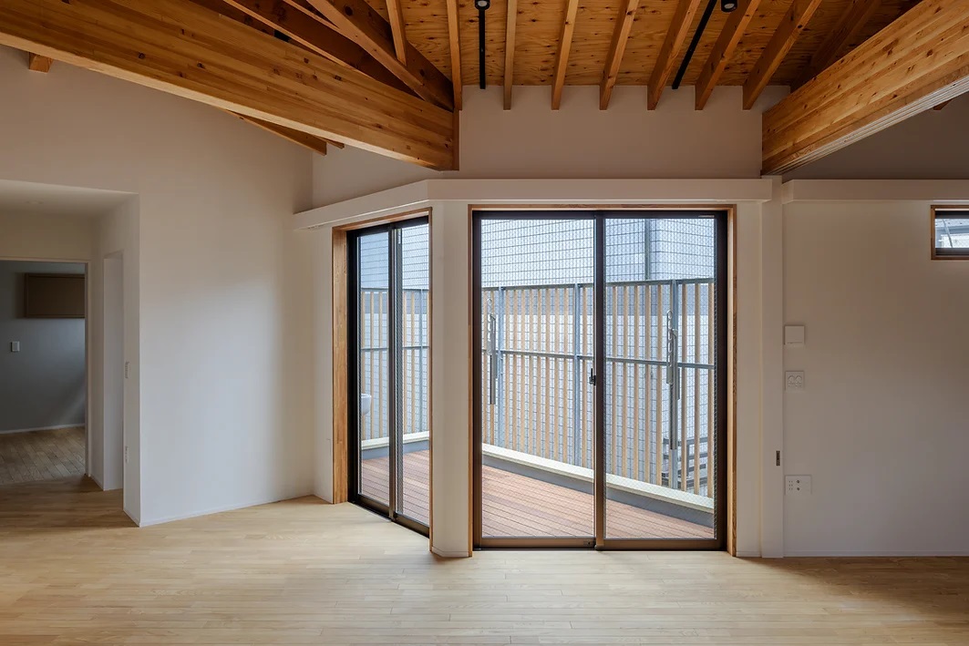 大きな窓を持つリビングは角度を40度振り、テラスを包むように設計しています。こうすることで、住宅に奥行きと余白ができ、空間に余裕が生まれます。