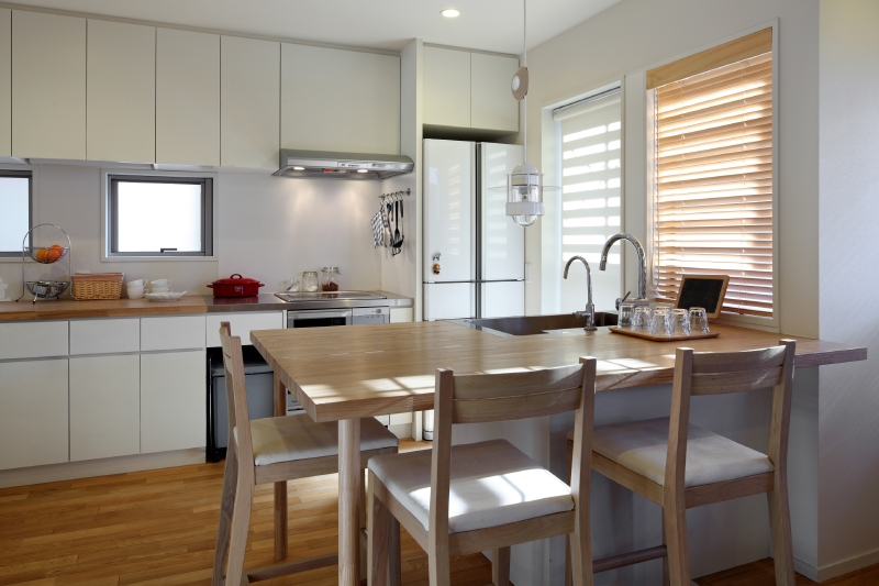 キッチンには、無垢の集成材を使用して造作することで、本物の木ならではの温もりと重厚感のあるキッチンとなりました。ローコストを意識しながらも、長く使うもの、日々手に触れるものは良い素材や製品を採用することで、暮らしの質と満足度が上がります。