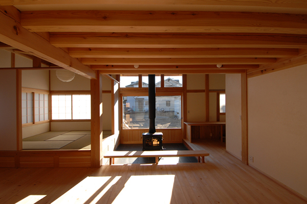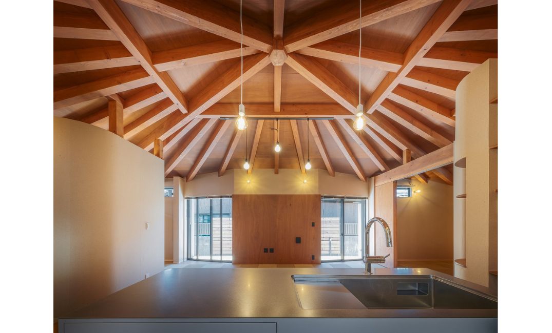 家の四隅から頂点に向かって梁を走らせ『かぶら束』を中心に据える木組みの工法で、家全体を包む天井と柱を落とさない大きなLDK空間を実現しました。