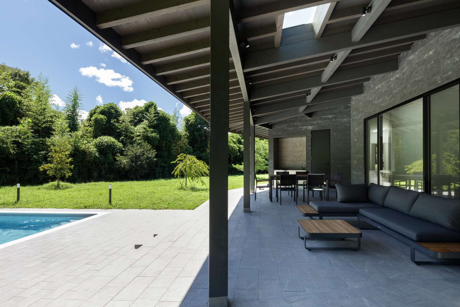 私は設計をする際に、外部の自然を内部とつないでいくような半屋外の空間づくりを重視しています。それでも最初に施主の方からアウトドアリビングに求める面積を聞いたときは、そんなに使いきれないのではないか、と思いました。