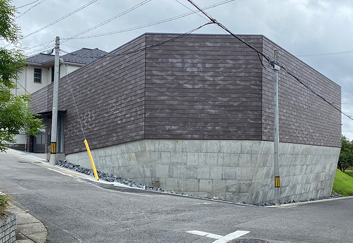 外壁には「鎧貼り」という重ね貼りの技法を採用し、地層が重なるようなデザインは連続的に巻きつき内部空間を包み込むような印象を与えます。基礎部分のコンクリートはランダムなサイズの型枠を使用し、高低差のある敷地に対応しています。