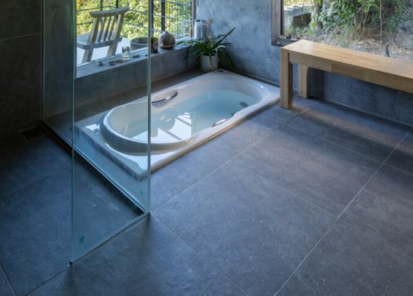 浴室の正面にある洗面所には一面に鏡を設置し、浴室の窓から見える景色がそのまま映り込むように工夫されています。浴室や洗面所の床、壁などは全体的にグレー調に統一されており、取り込む緑の鮮やかさをより一層引き立てています。また、テラスの手すりも極力細く設計し、できる限り景色を妨げないようにしています。