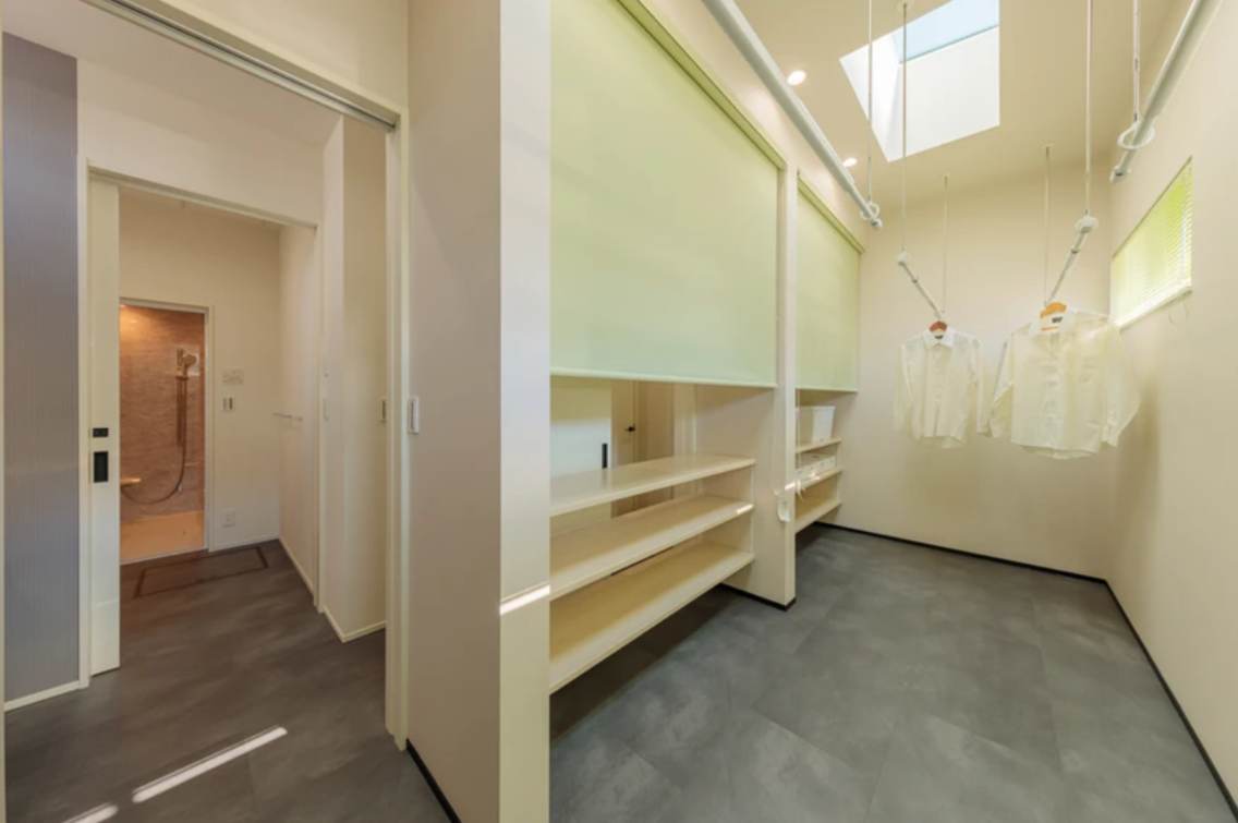サンルームは天窓で日当たりもよく、洗濯を終えた洋服をすぐに片付けられるよう、収納棚を設置。上部にはハンガーバー、下部は可動棚になっています。収納棚のはオープン棚になっているので、廊下側からも洋服が取り入れできます。同じ場所でアイロンを掛けたり、洗濯が畳めるようテーブルを設置。 洗濯家事負担が少なくなるような動線にしています。