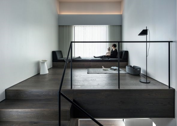 リビングの役割として、奥様は在宅ワークの際に集中して過ごしたいというご要望や、旦那様は大の字になって寝ころべるような場所が欲しいという声があったため、ダイニングと切り分けたほうが過ごしやすいだろうと考えました。段差により屋内の視線も切り替わり、窓辺のソファで外光の変化を感じながらゆったり過ごすことができます。