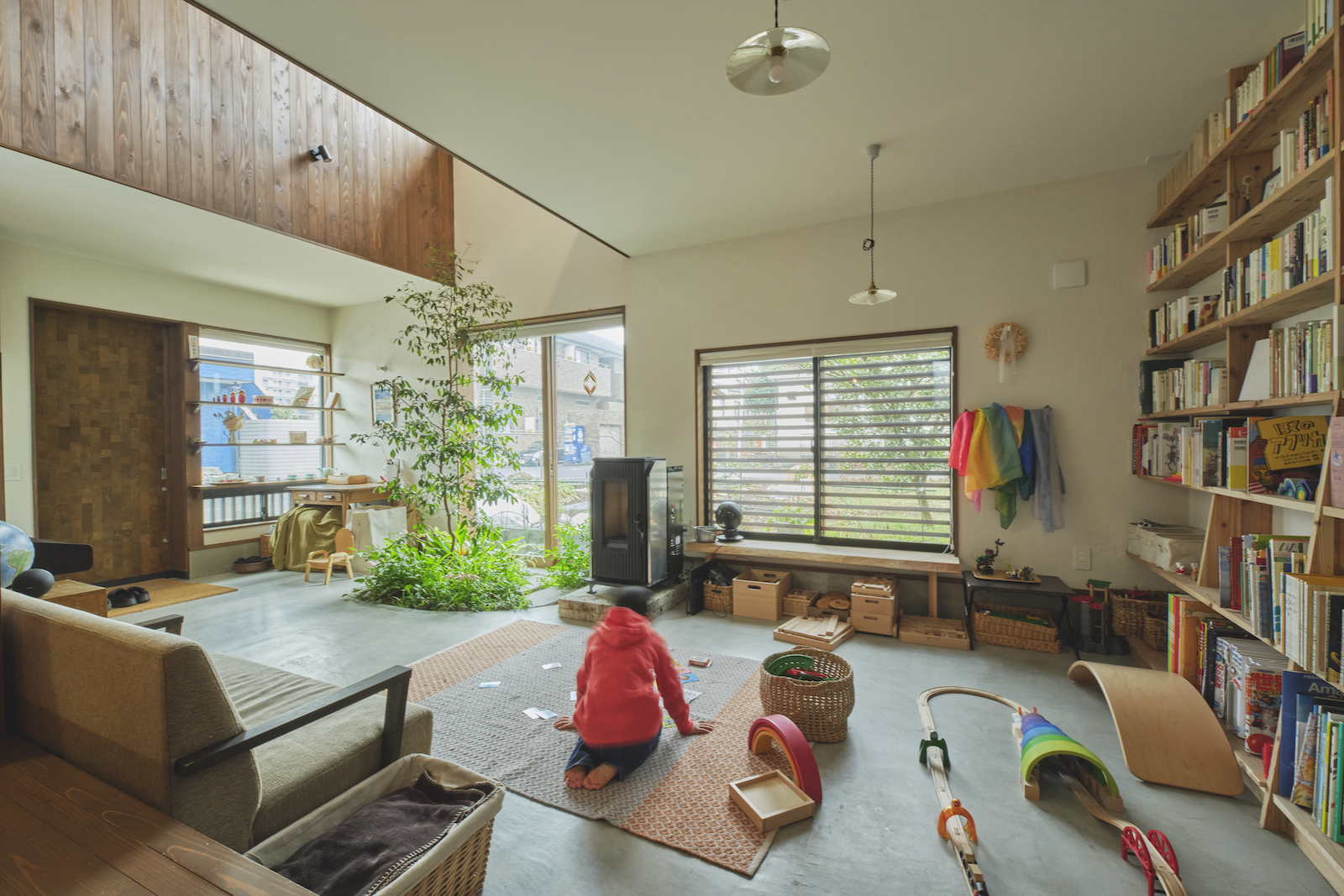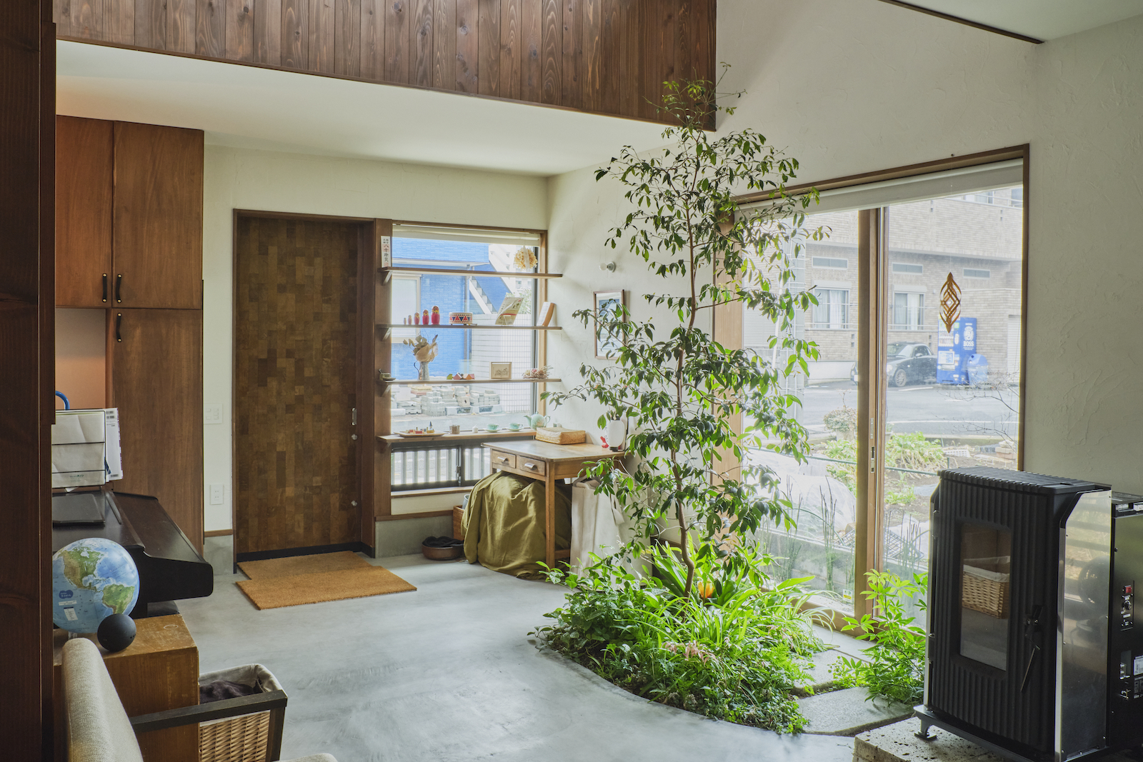 『本と土間の家』では室内に植栽スペースを設けました。 施主の方からは自然とつながるような暮らしをしたいという要望がありました。しかしスペース的に、庭をとることは難しく、自然を感じられるような室内空間を設計することとしました。玄関からつながる土間スペースに本物の木々を植え、その南側に大きな開口部を設けています。そこから入る風は木を伝って清々しい空気を運んできます。ちなみに外には隣家の畑があり、借景としてより自然との繋がりを感じさせてくれます。植栽スペース横の踏み石は、窓の外まで繋げて空間の連続性が生まれるように意図しました。 建具もよりなじませるため木で造作し、断熱ブラインドをつけて性能面をカバーしています。このように庭を設けるのが難しい場合でも、自然を感じる空間を持つことは可能です。理解しておくべき点としては、コンクリートの鉢のような形で土間に植栽スペースを設けるので、水抜きの穴などから虫が入ってくることはあるということです。そういった手入れも含め本物の木々の存在を楽しめる方にはおすすめできるアイデアです。