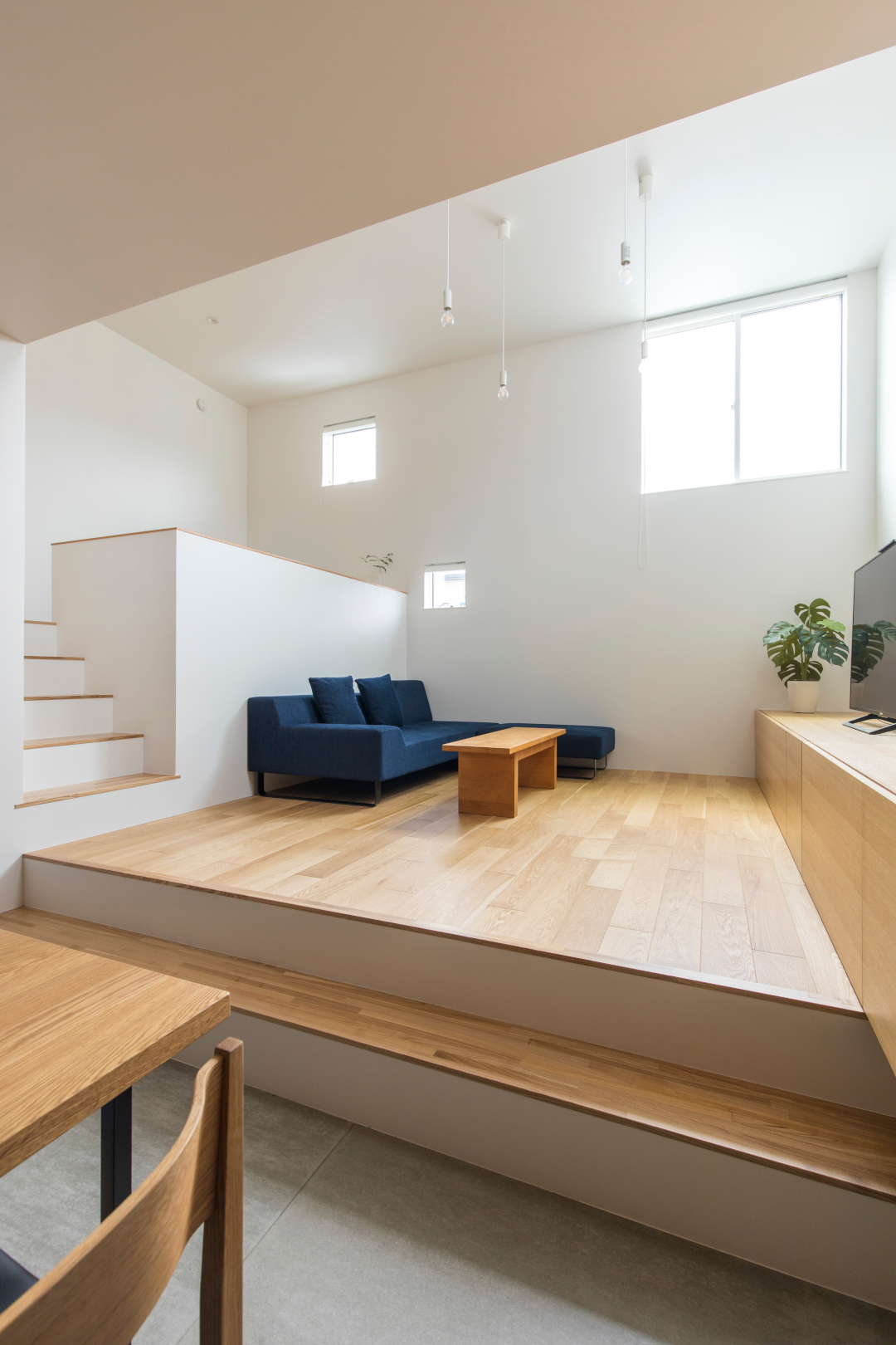 仲の良いご家族なので、このスキップフロアを活かし、完全に個室で分けるのではなく、段差を利用して個々の居場所を作りながら、家族全員が優しくつながる住まいとなりました。家族やその友人たちが、それぞれの居場所で自然とコミュニケーションを生み出し、楽しい住まいになったことが印象的です。