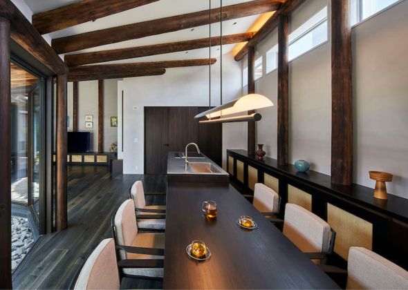 庭に出た時に楽しめるだけでなく、自然光が反射して壁や天井に水面の影が映ったり、雨上がりには軒先から落ちる雫が水面を揺らして動きを見せるなど、自然の変化を室内へと引き込む役割を果たします。