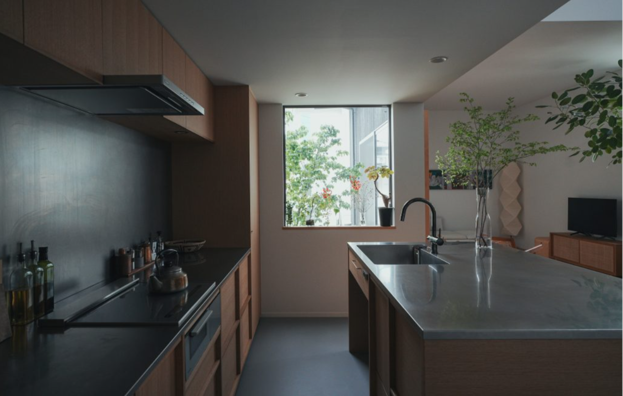 次に、室内の明るさです。明るすぎず、ちょうどいい光の量を取り込むため、窓は必要な場所にだけ設け、過剰な採光を避けました。カーテンやロールスクリーンは設置せず、窓から見える植栽を楽しめる設計にすることで、緑と自然光を取り入れながらも、外の視線を気にせず過ごせます。また、夜は柔らかな照明で、空間全体が穏やかで心地よい雰囲気に包まれます。